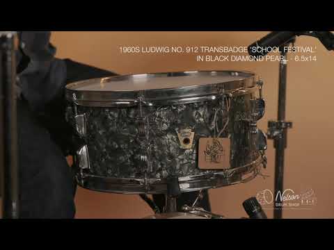 1960s Ludwig No. 912 TransBadge 'School Festival' in Black Diamond Pearl - 6.5x14 Video demo in the photo scroll! A very sweet player's drum with some collectible charm. Red ink… Read more